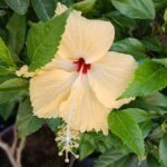 O Hibisco floresce principalmente na primavera e verão, com floração durando cerca de três meses. Suas folhas são verde-escuras, perenifólias, e o crescimento é considerado moderado.